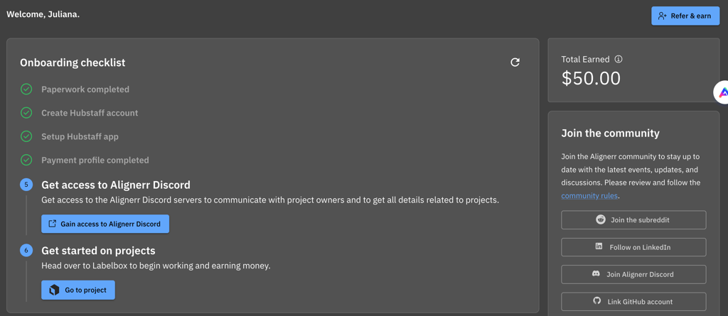 Alignerr is an AI-powered remote jobs platform where freelancers and side hustlers can earn solid money by labelling data, reviewing AI content, and helping improve new tech. No lengthy interviews or degrees required! Sign up, complete a quick onboarding checklist (shown in the screenshots), and you’re ready to take on paid projects.